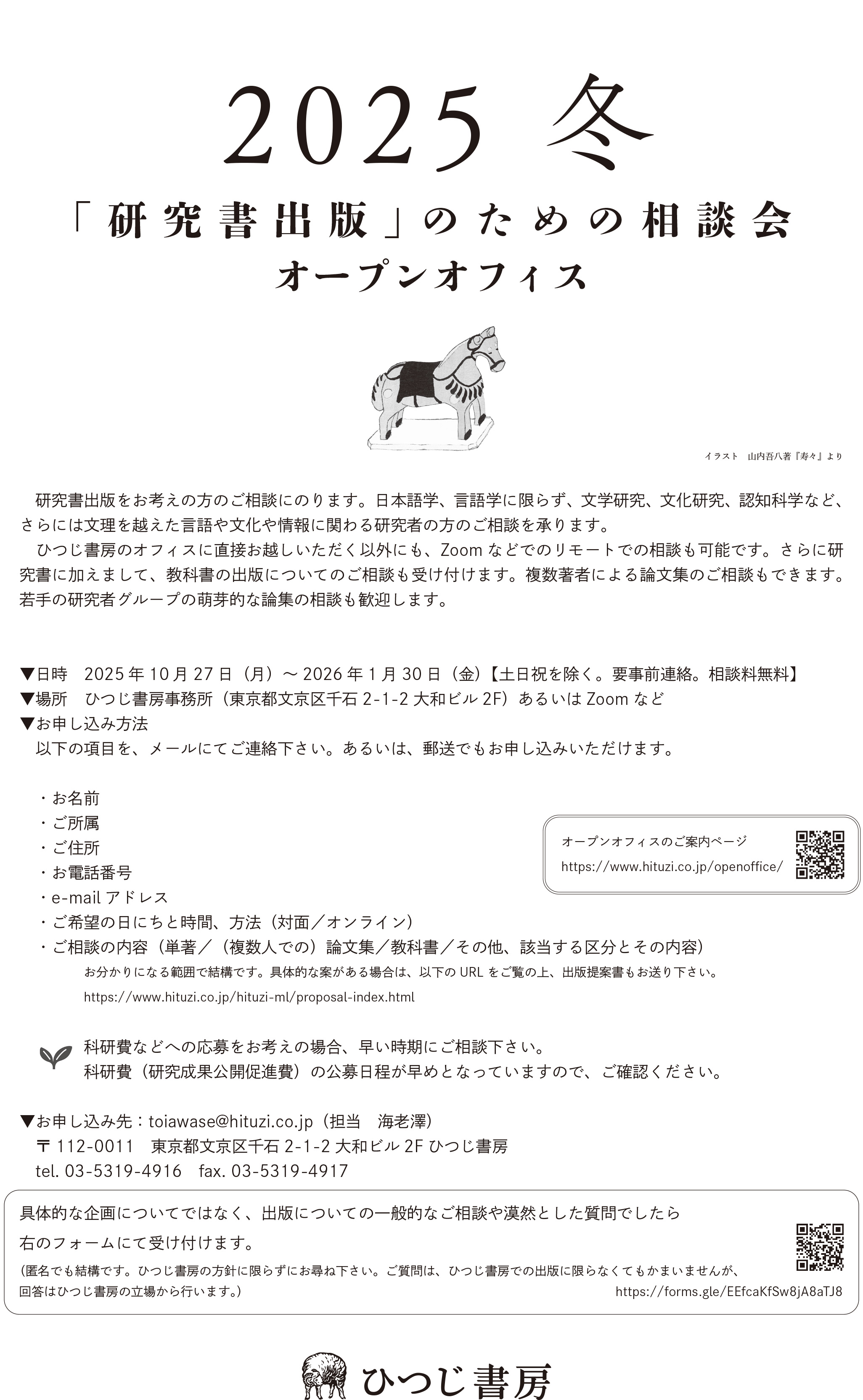 ひつじ書房のオフィスに直接お越しいただく以外にも、Zoomなどでのリモートでの相談も可能です。さらに研究書に加えまして、教科書の出版についてのご相談も受け付けます。複数著者による論文集のご相談もできます。若手の研究者グループの萌芽的な論集の相談も歓迎します。